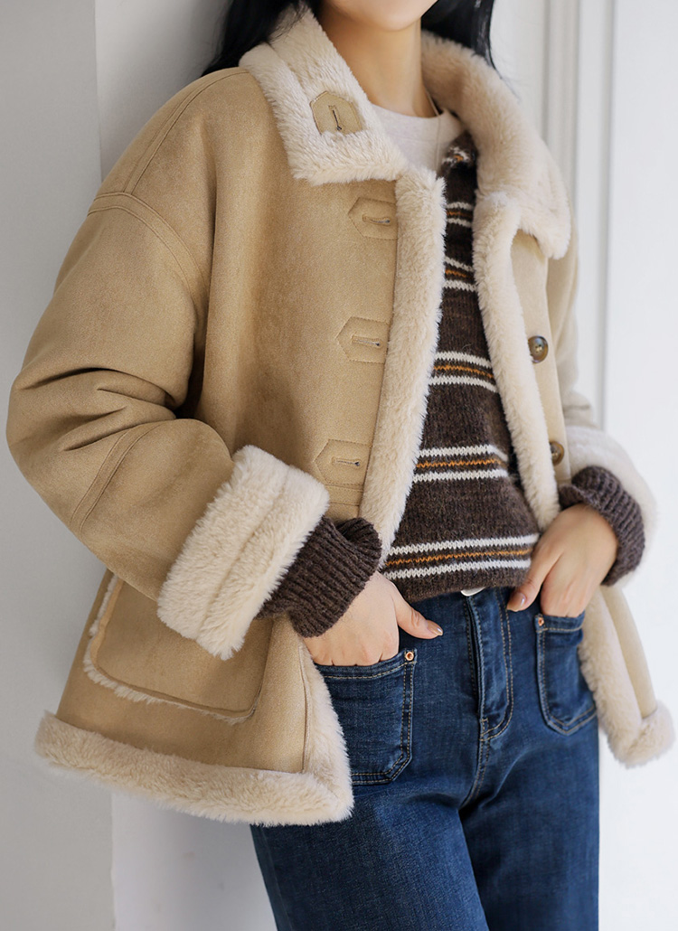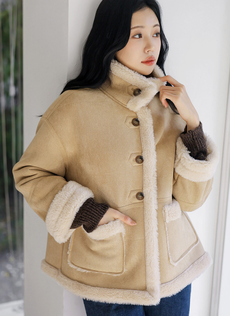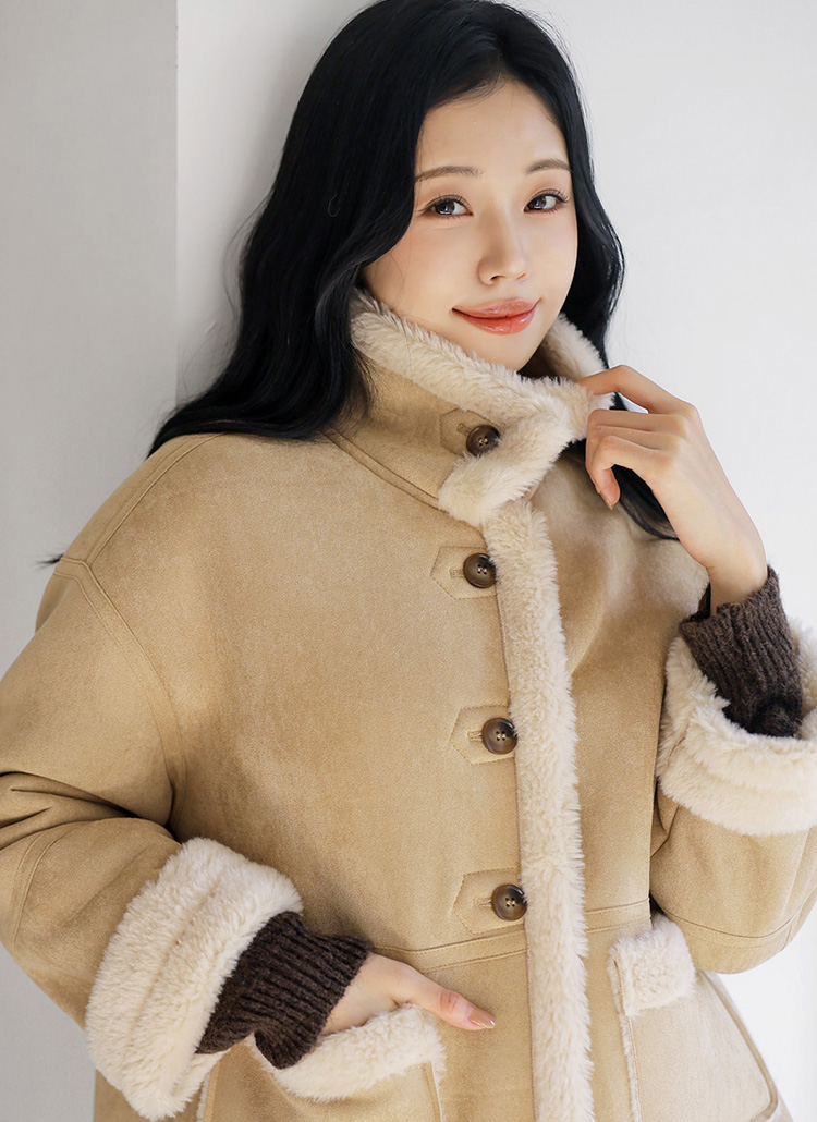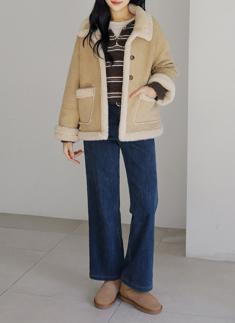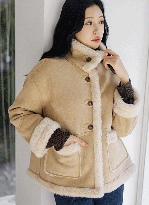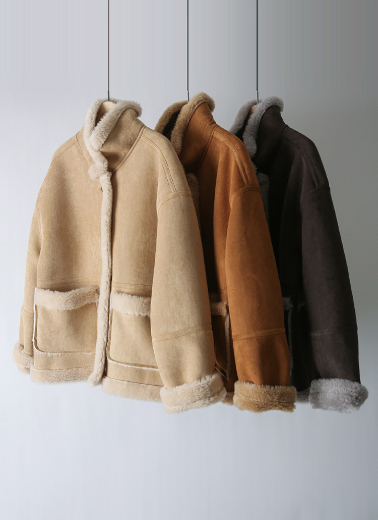 스웨이드 텍스처의 무스탕 소재에 부드럽고 포근한 퍼 안감을 더해