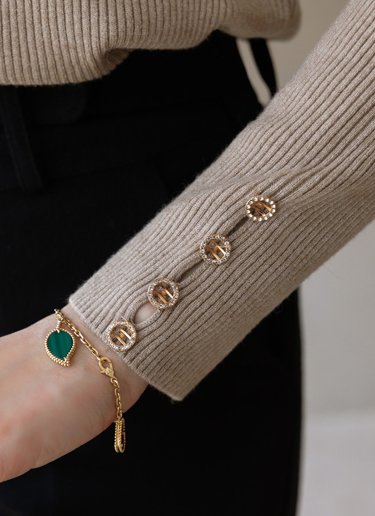 어깨와 소매 라인을 따라 미니멀한 큐빅 버튼이 은은하게 포인트되어