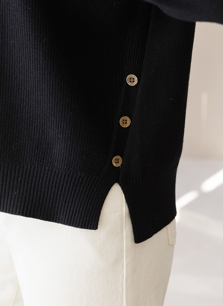 옆선으로 살짝 더해진 트임과 버튼 디테일로