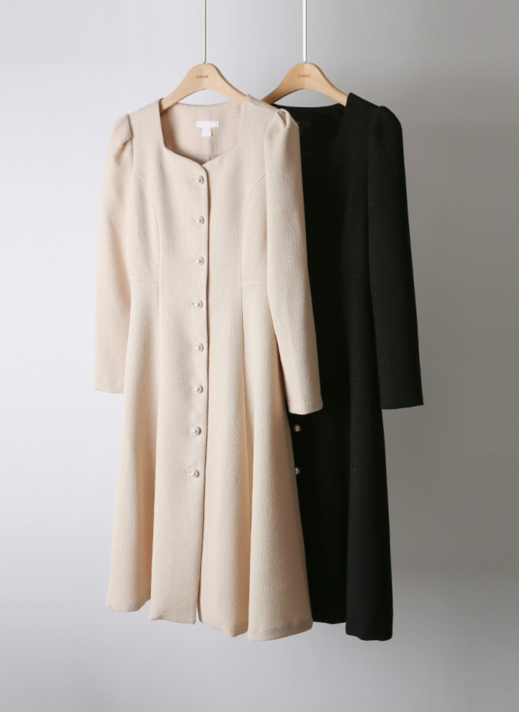 볼드한 진주 버튼과 고급스러운 트위드 소재가 만나