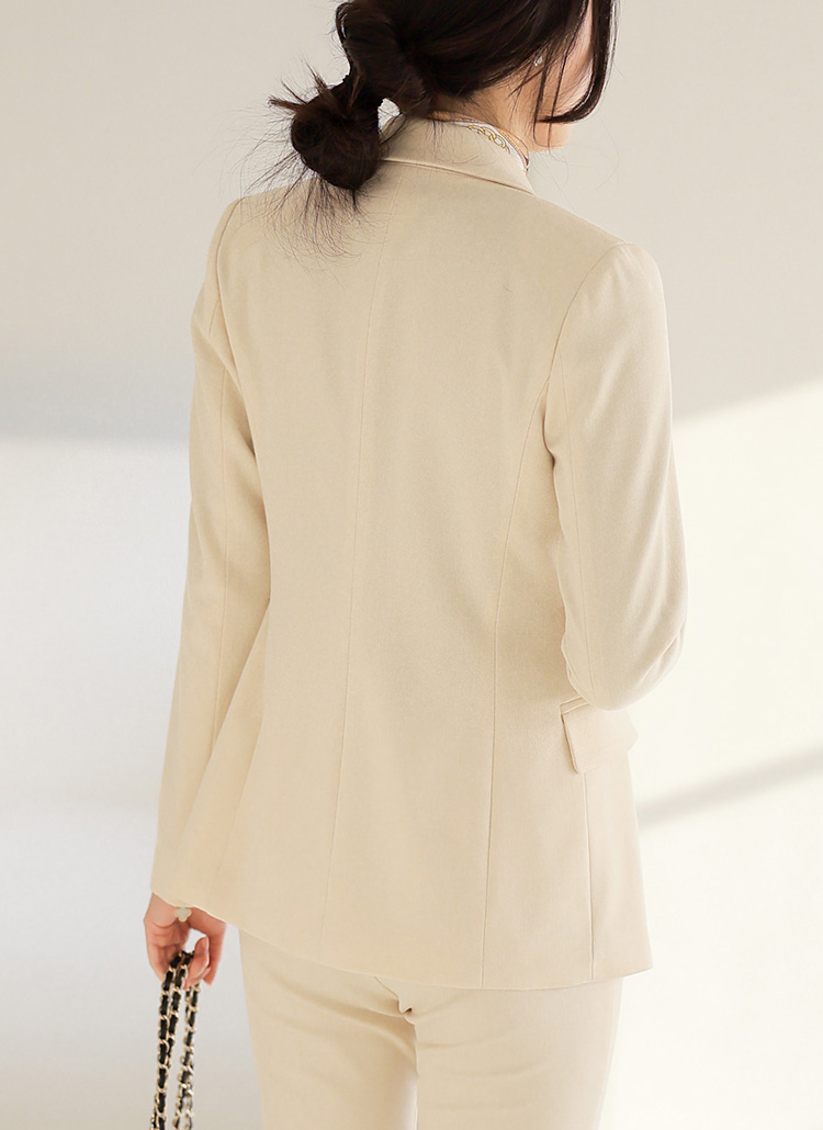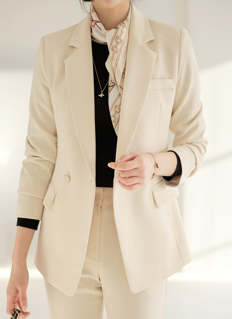 단정하게 떨어지는 테일러드 카라와 더블 버튼 디테일이 어우러져