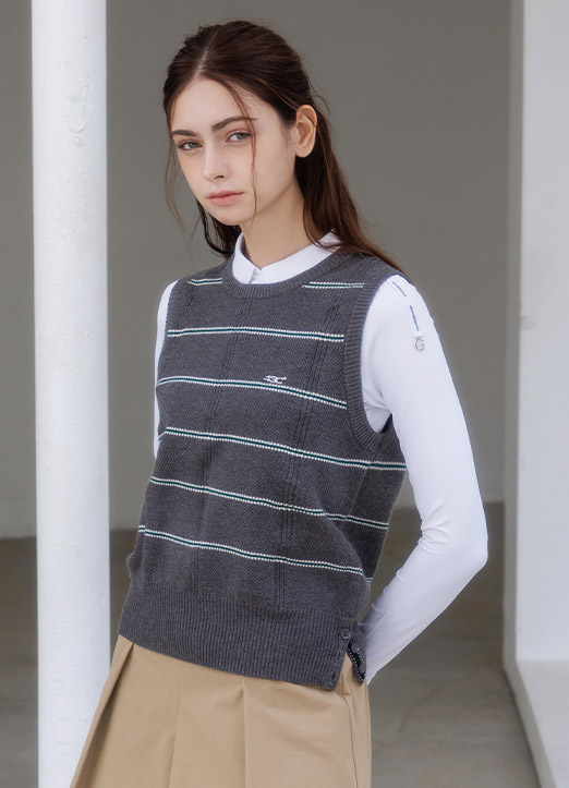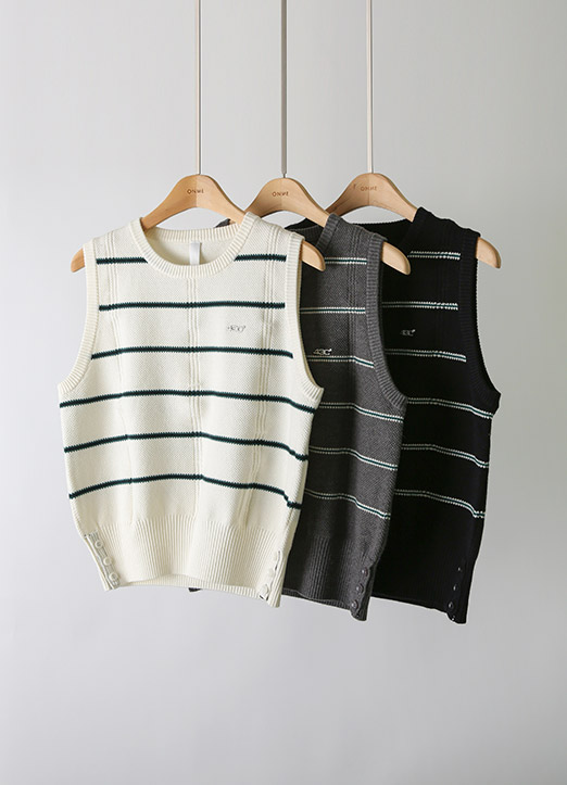 고급스러운 짜임과 스트라이프 패턴이 돋보이는 니트 베스트입니다.