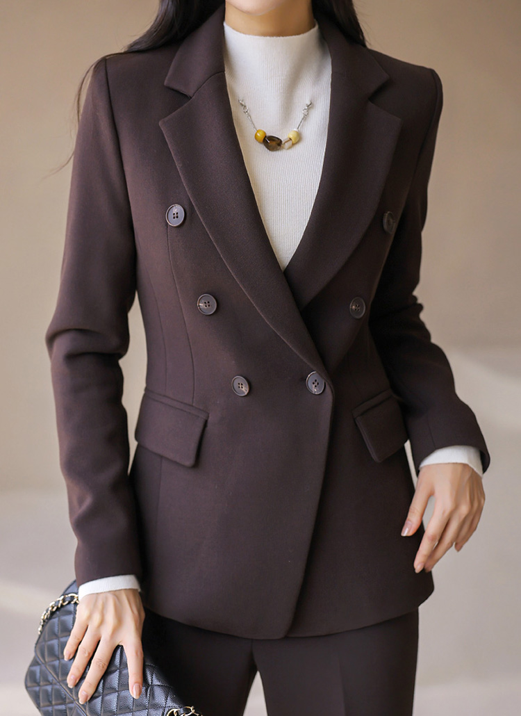 정교하게 잡힌 테일러드 카라와 더블 버튼 디테일이