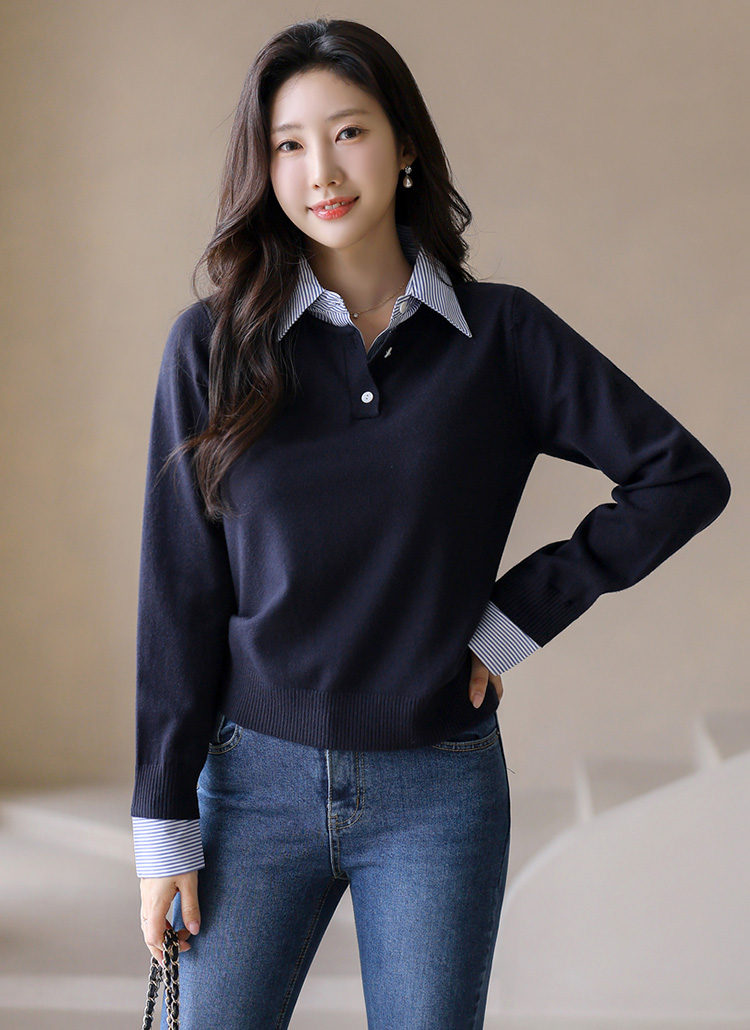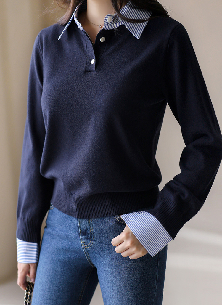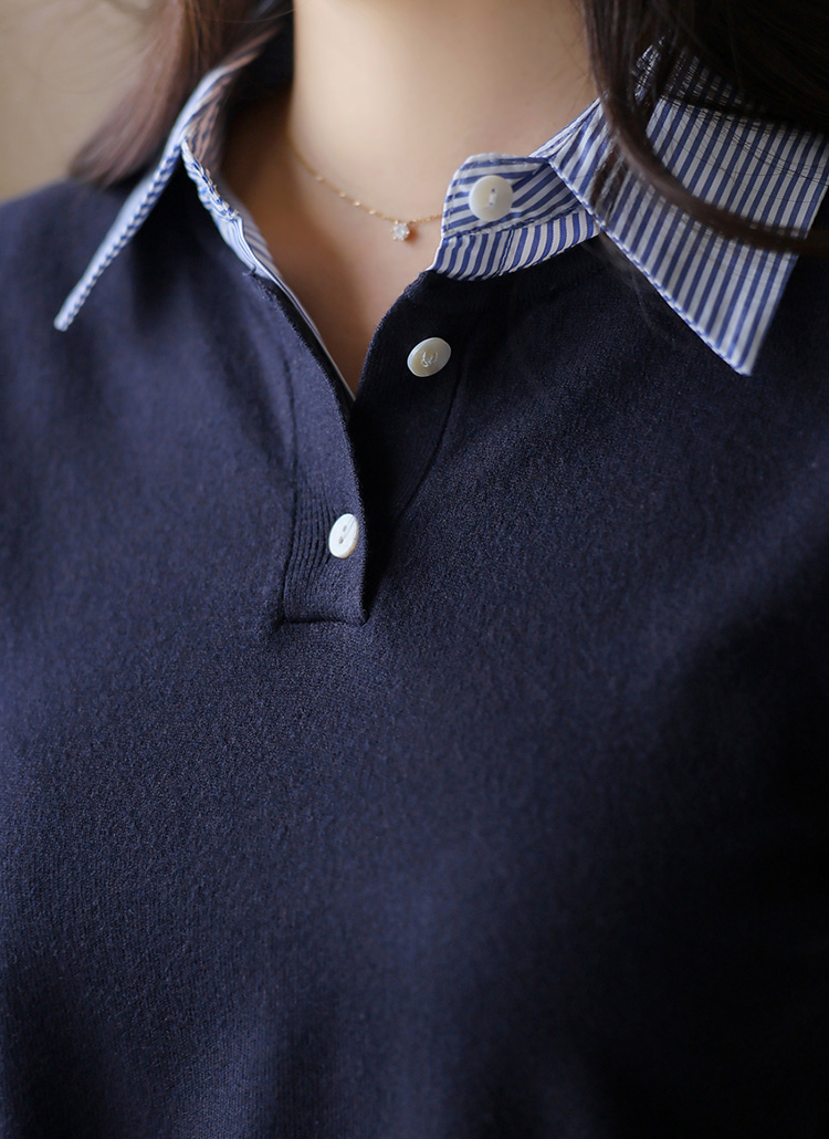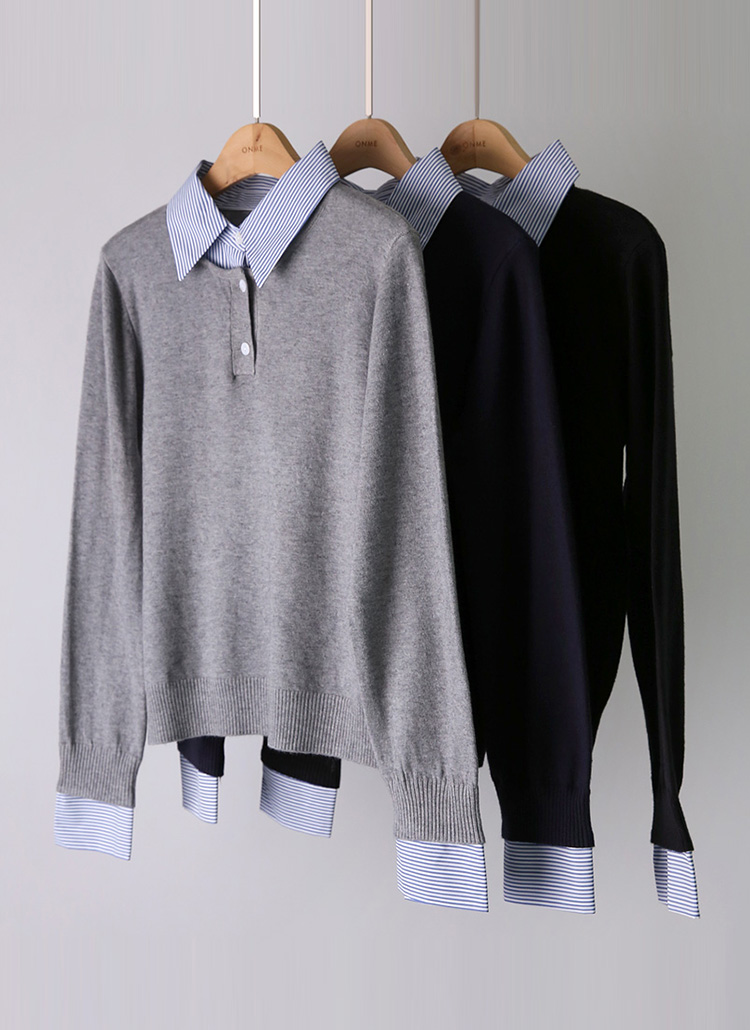 카라와 소맷단에 셔츠 배색을 더해 레이어드한 듯 스타일리시한 느낌을 주는 니트에요 :)