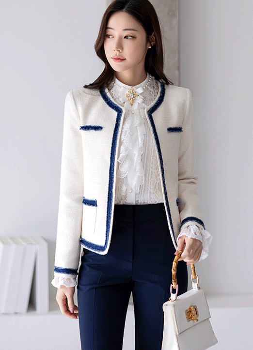 퀄리티 높고 고급스러운 무드를 선사하는 배색 트위드 자켓이에요