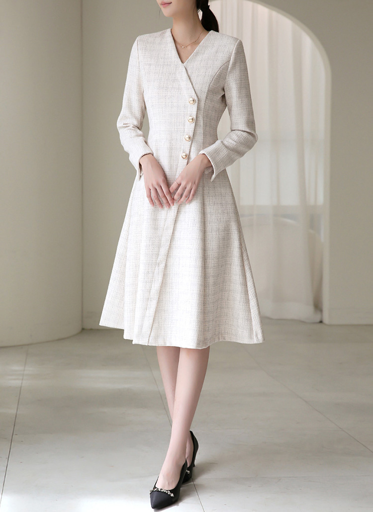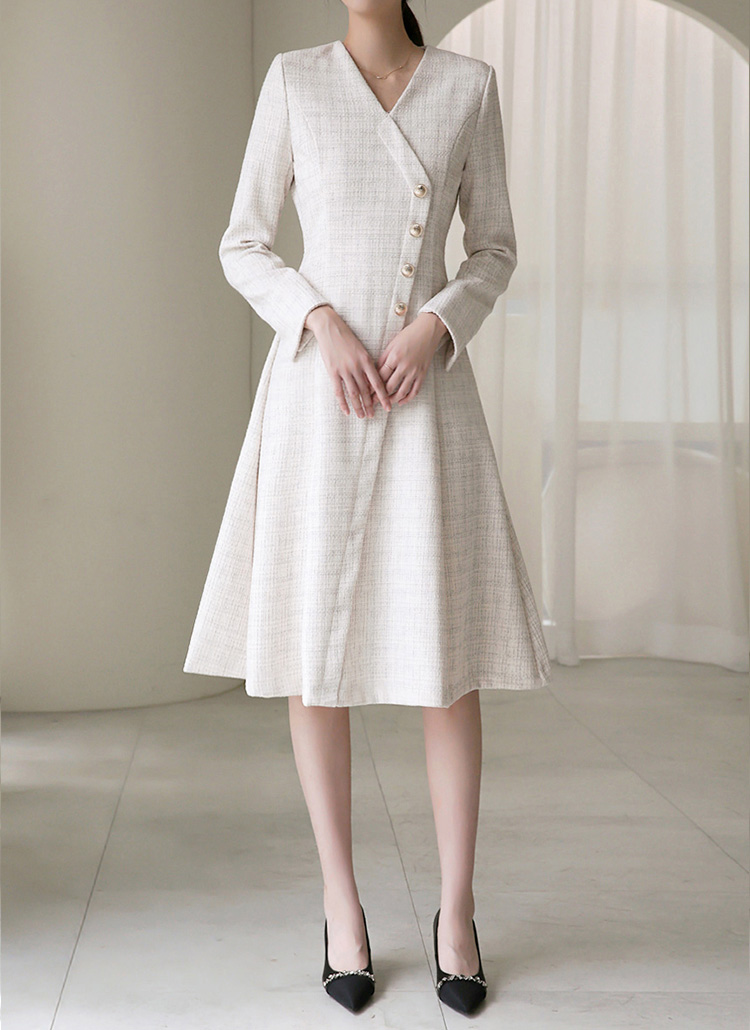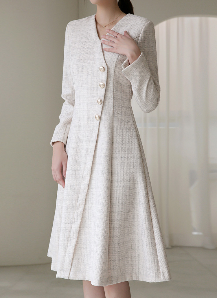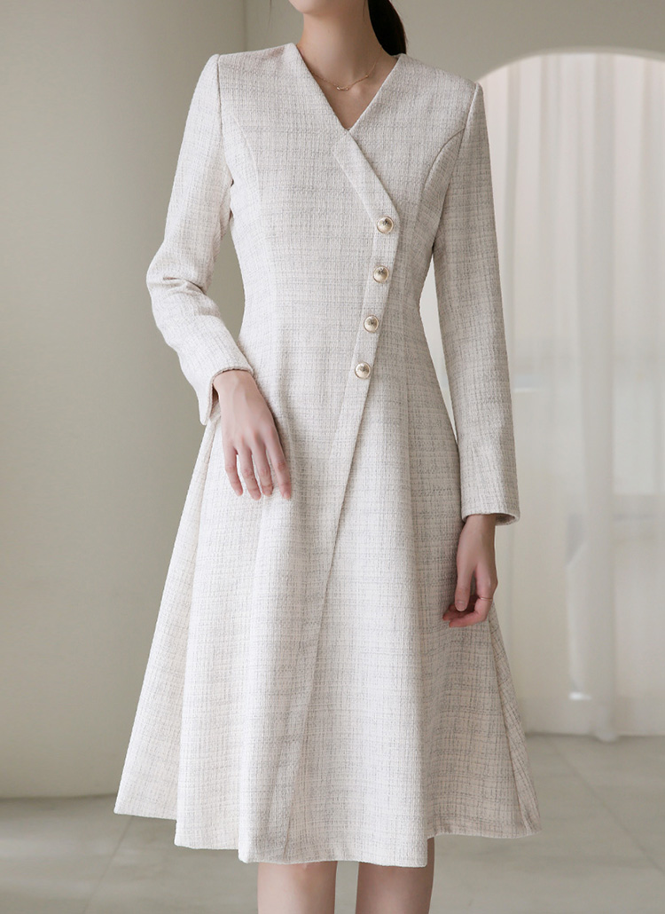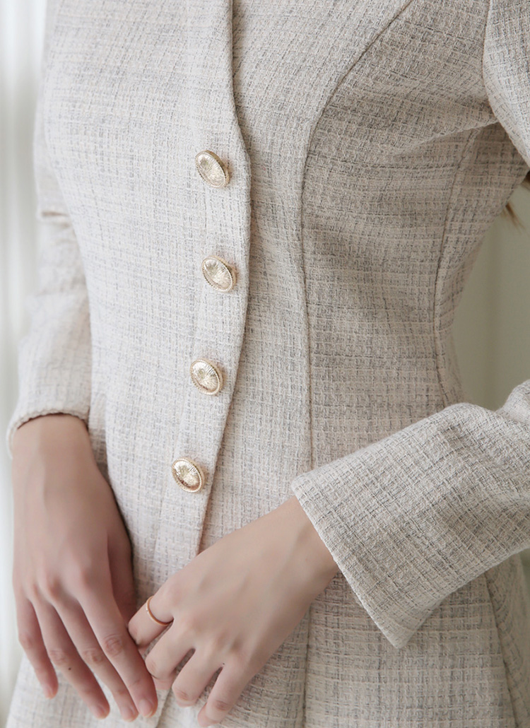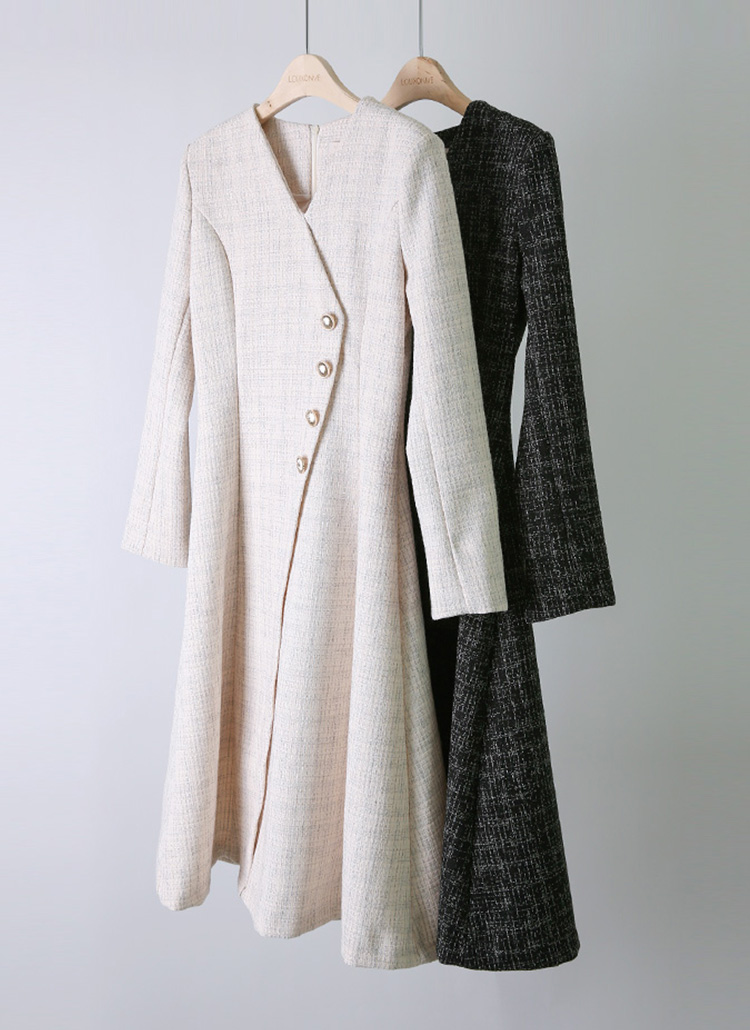 랩 디자인 골드 버튼 A라인 플레어 트위드 롱 원피스에요 :)