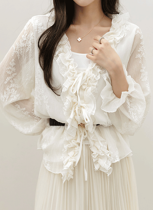 앞면 여밈 라인을 따라 여러 겹으로 레이어드된 프릴 디테일이