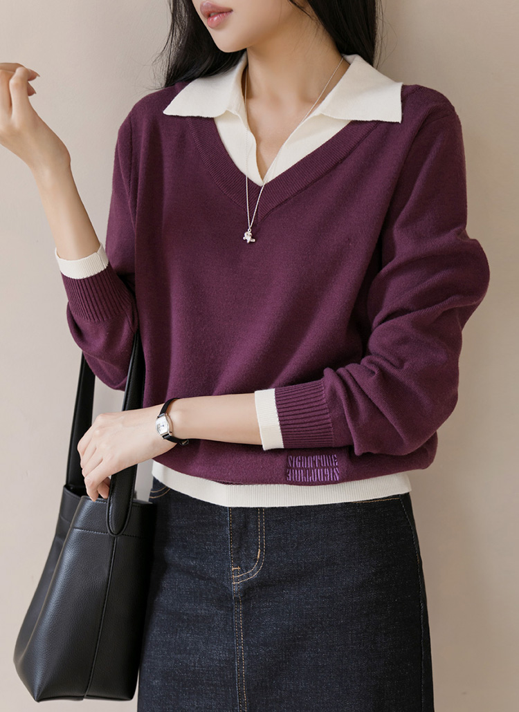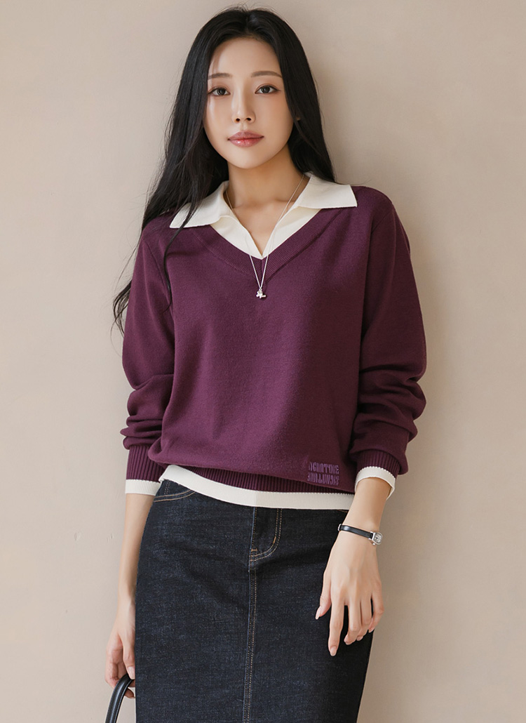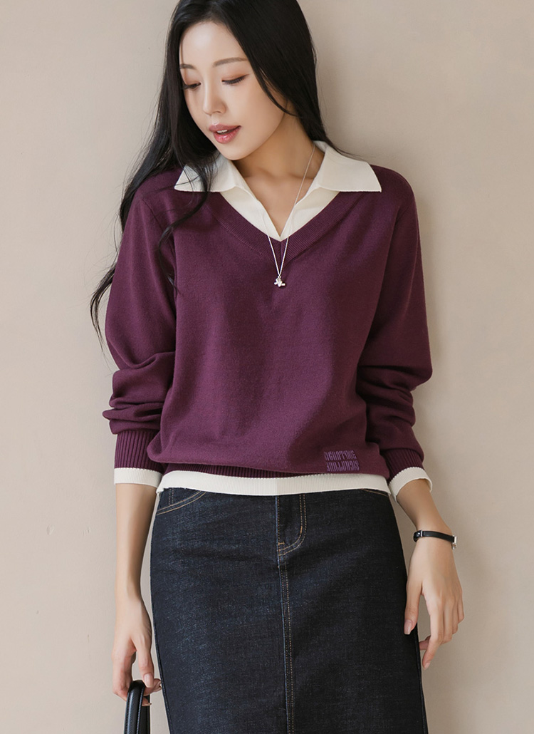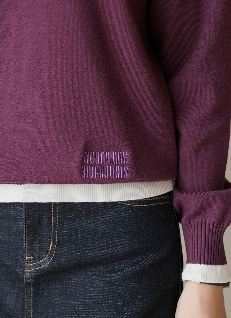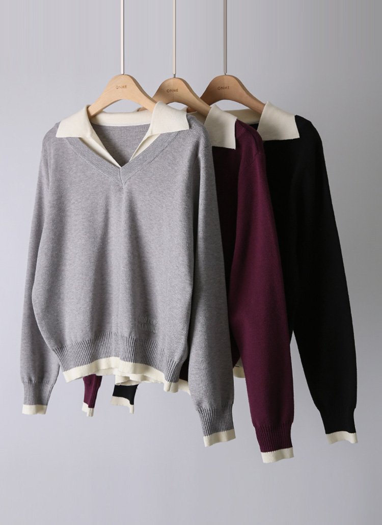 #[Theonme] 시그니 레터링 자수 배색 브이카라 비스코스 니트♥