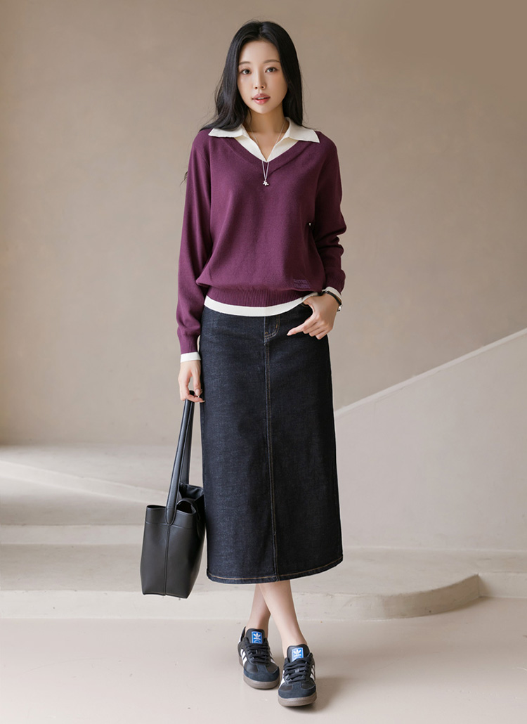 브이넥 디자인에 카라 이너를 레이어드한 듯한 유니크한 디테일이