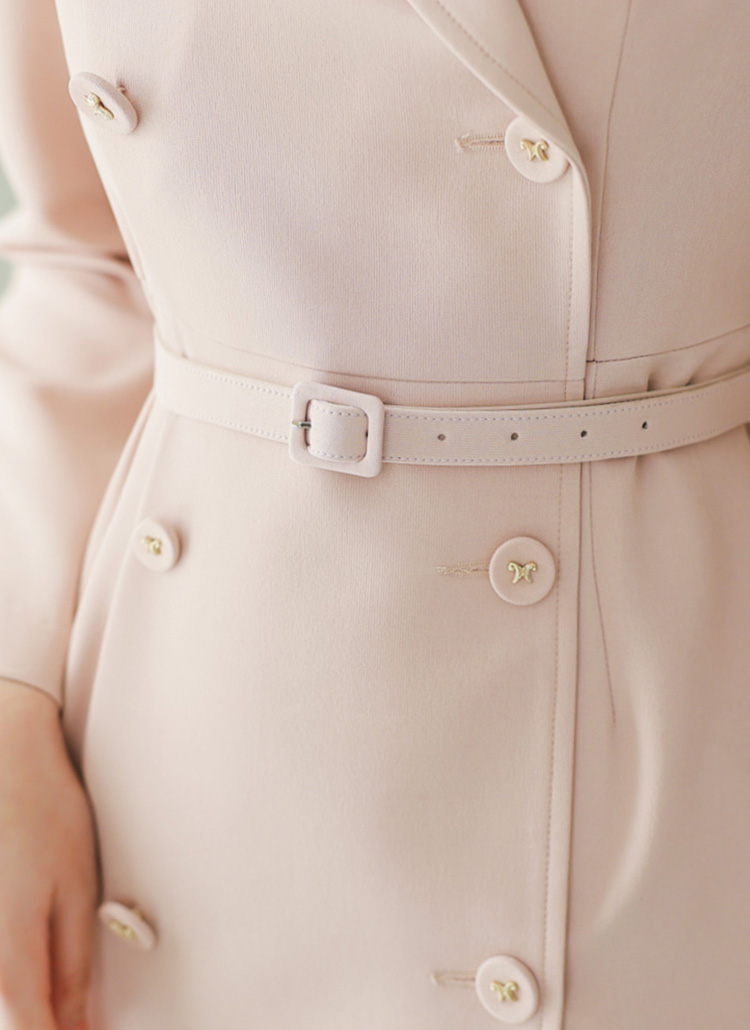 테일러드 칼라와 더블 브레스트 버튼으로 클래식한 매력을 더하며