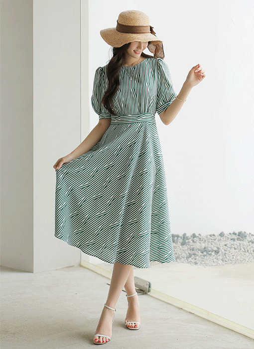 세련된 스트라이프 패턴에 퍼프소매로 러블리함을 더한