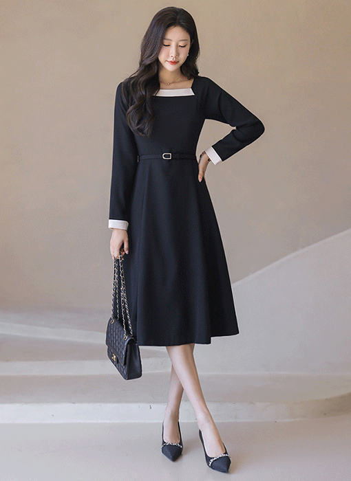 배색 라인이 돋보이는 스퀘어 넥 디자인으로