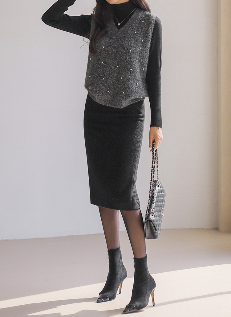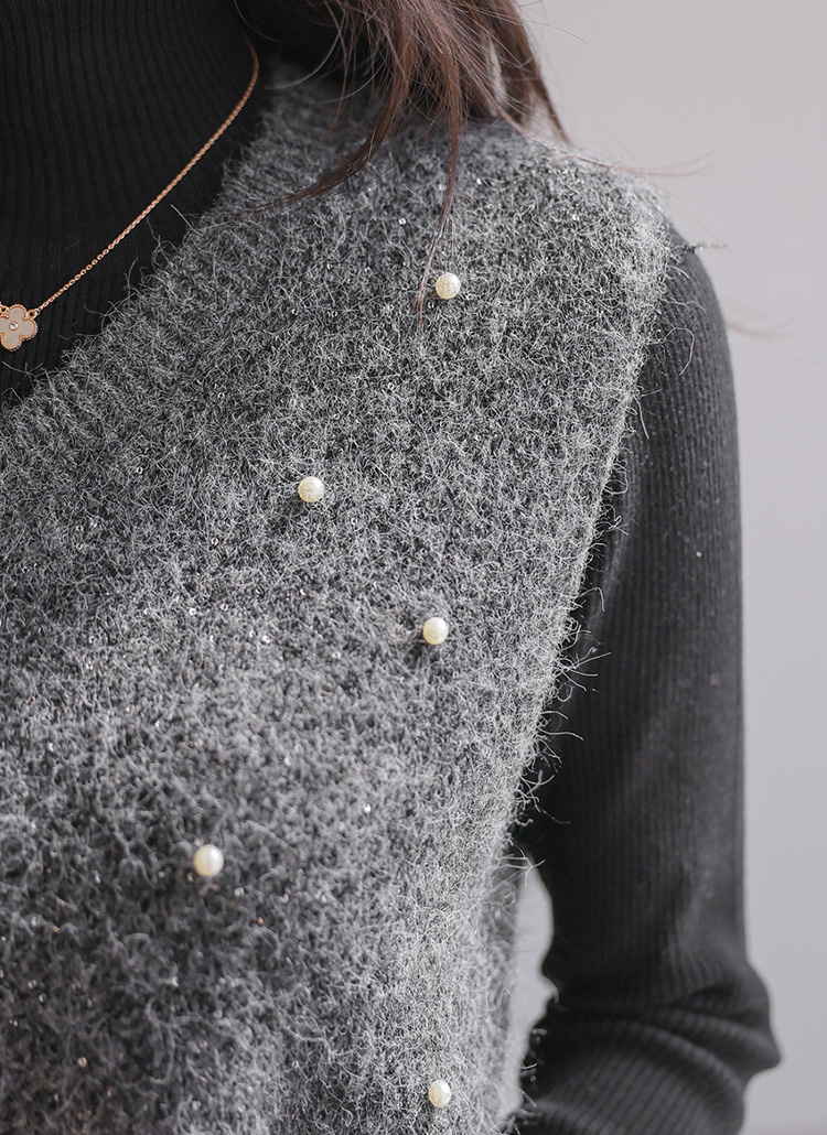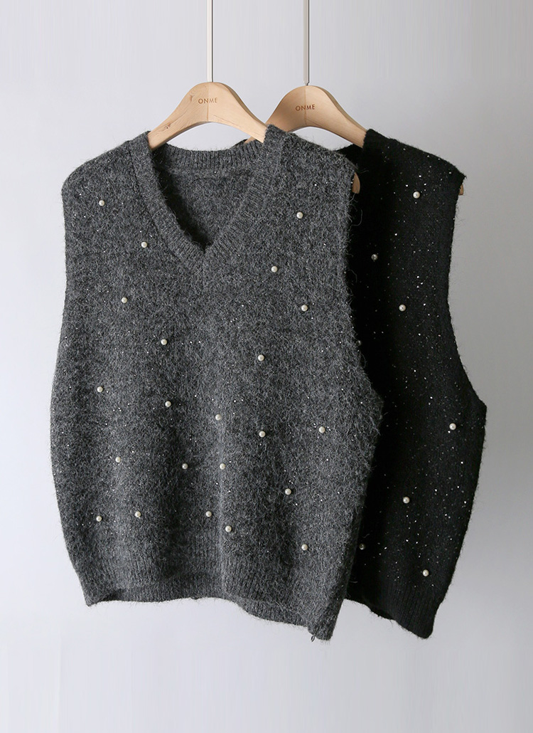 포근한 부클 소재에 진주와 스팽글 디테일로 화사함을 더한 니트 조끼에요 :)
