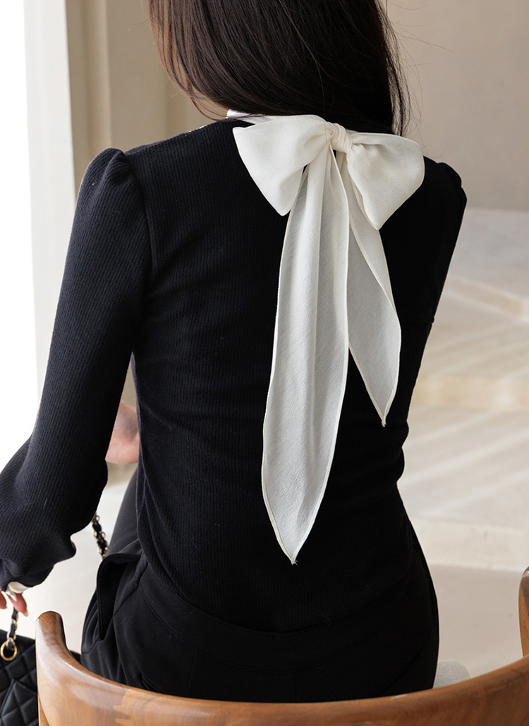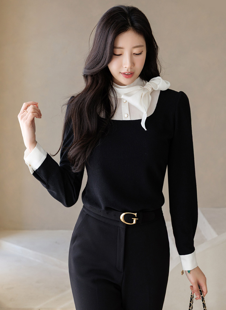 목선과 소매 부분을 블라우스 소재로 섬세하게 배색해주어