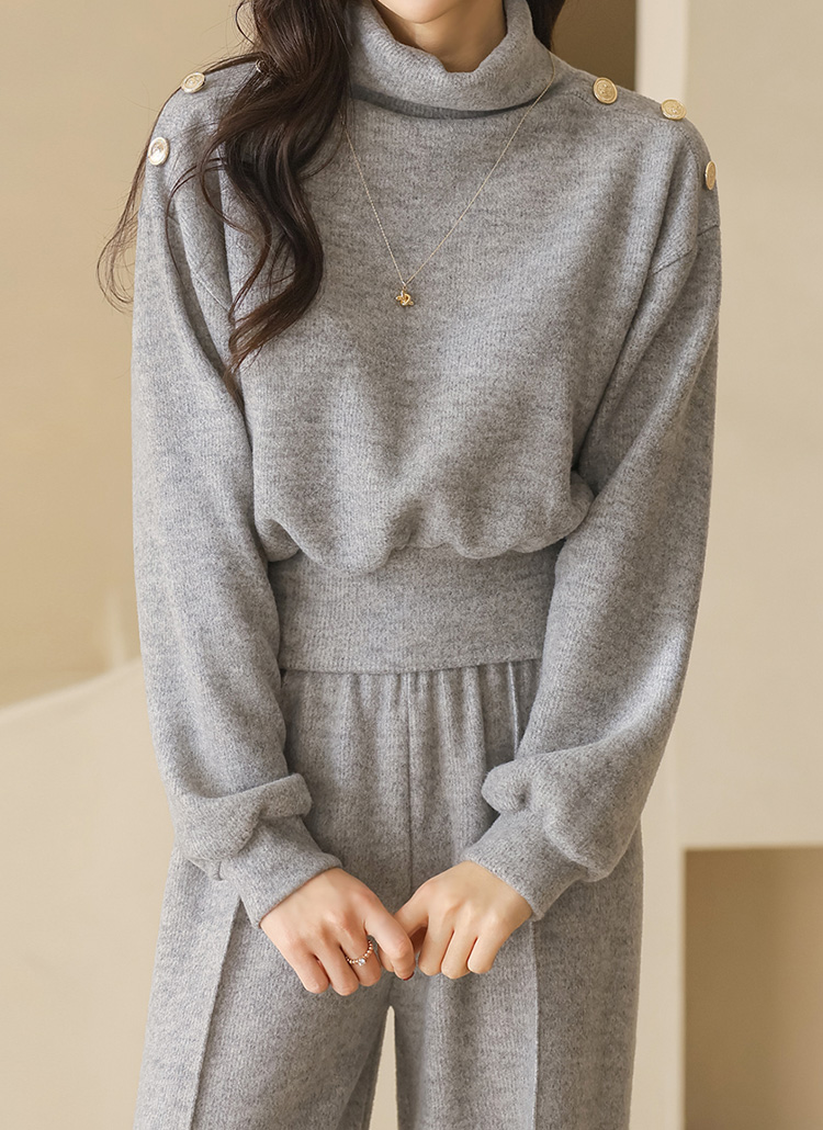 상의는 터들넥 디자인으로 목선을 포근하게 감싸주며