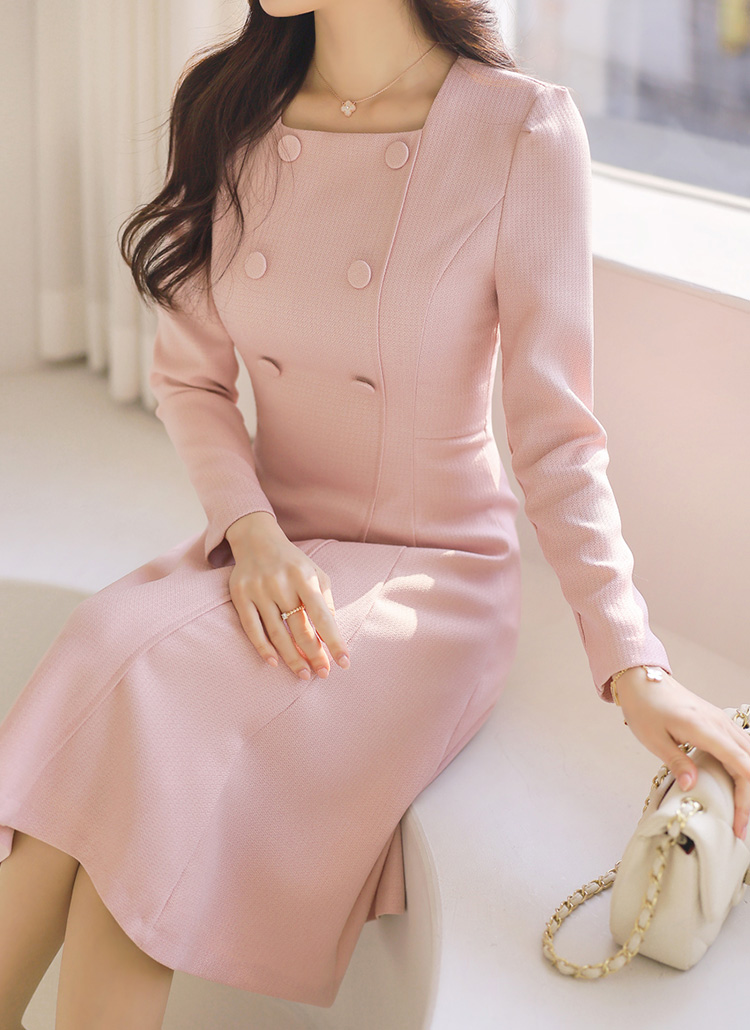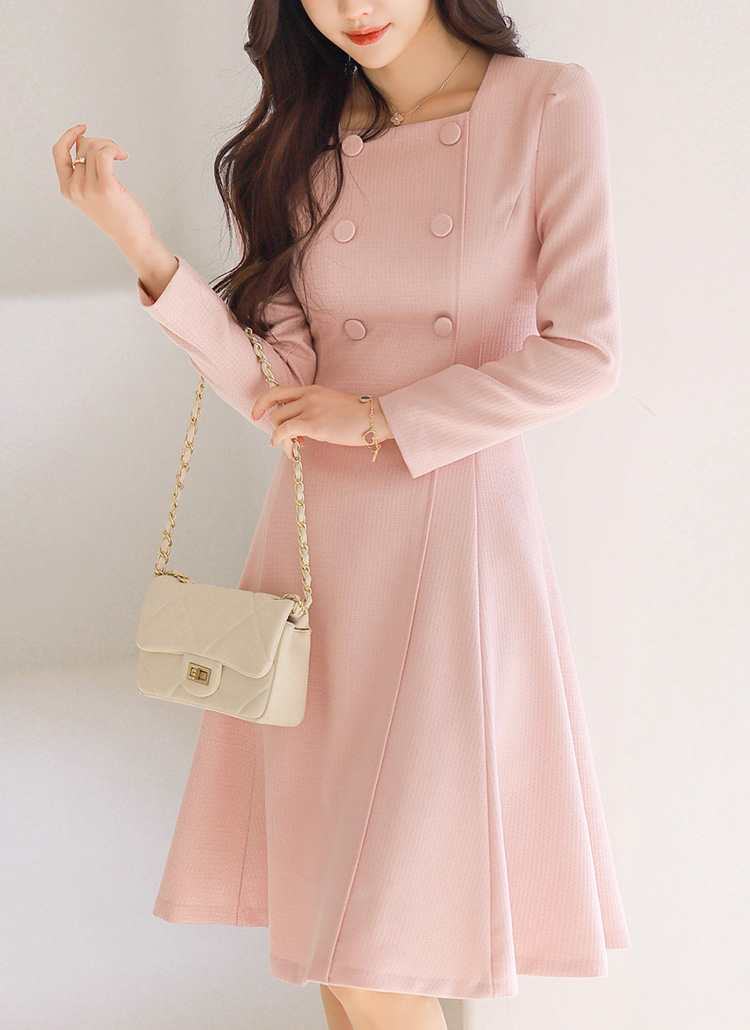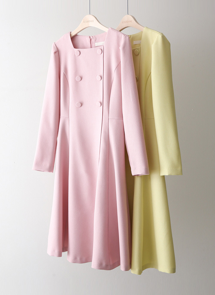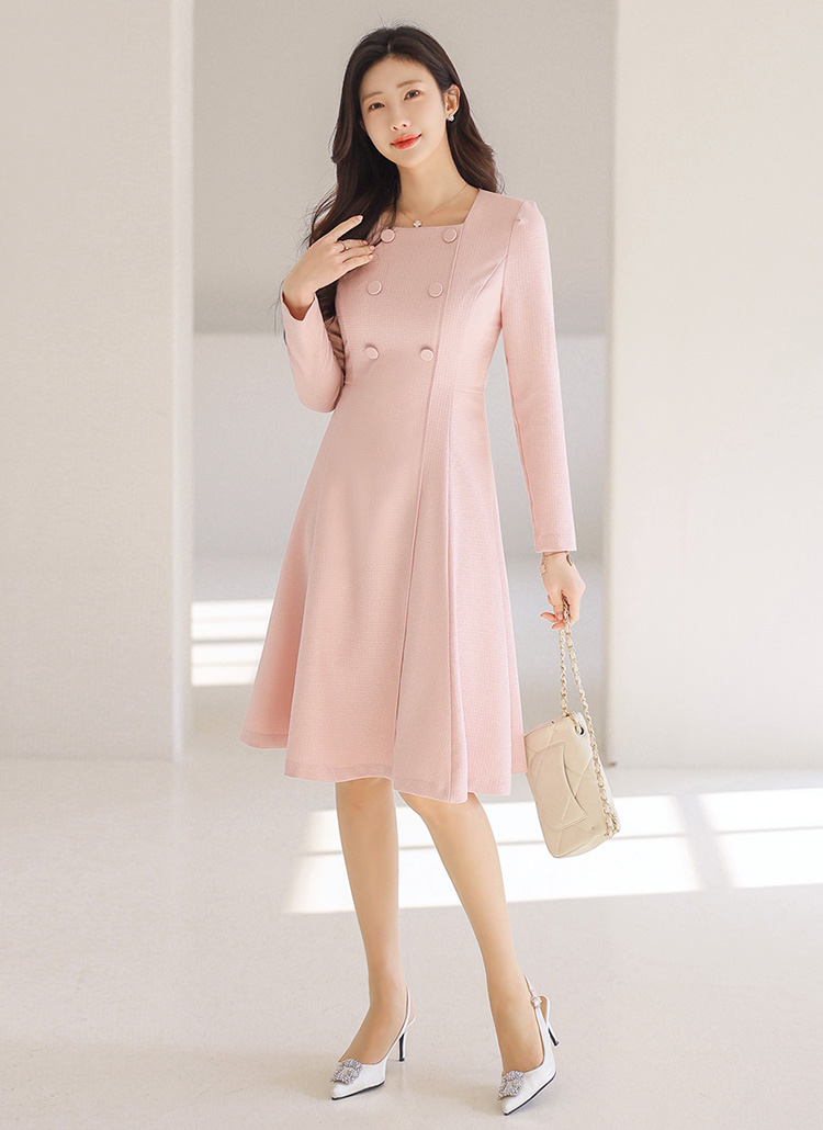 클래식한 무드 속에 여성스러운 실루엣이 돋보이는 플레어 미디 원피스에요