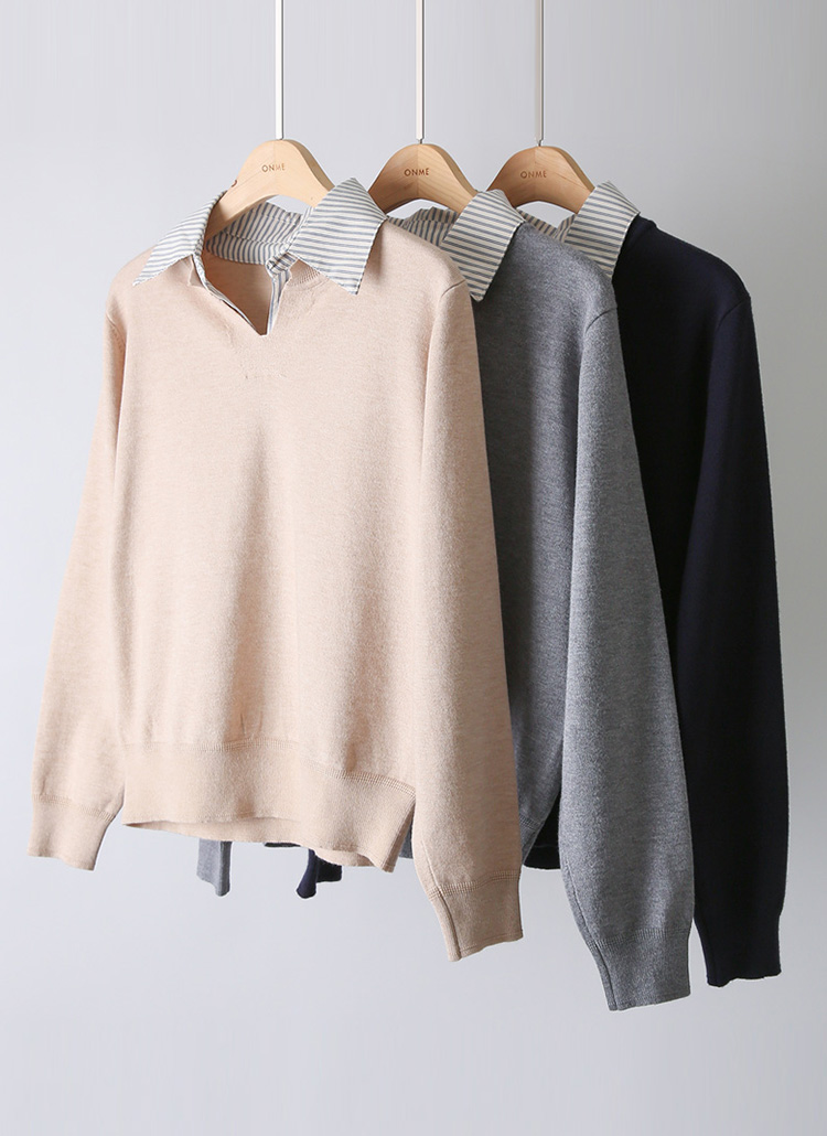 [Theonme] 그레인 스트라이프 카라 레이어드 비스코스 니트