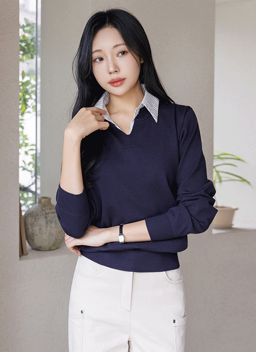 트렌디한 스트라이프 카라 레이어드로 산뜻한 포인트를 준