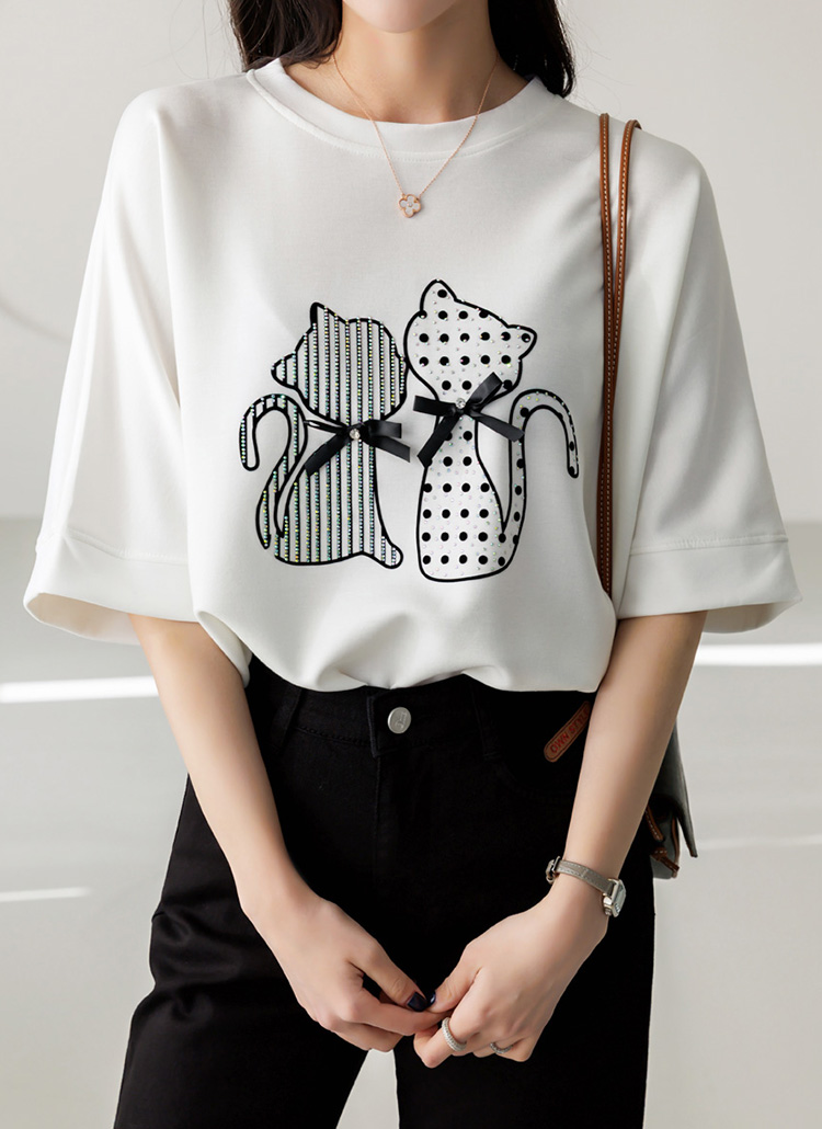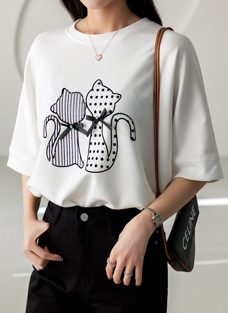 리본 블링캣 퐁실퐁실 소프트 터치감 오버핏 7부소매 프린팅 티셔츠