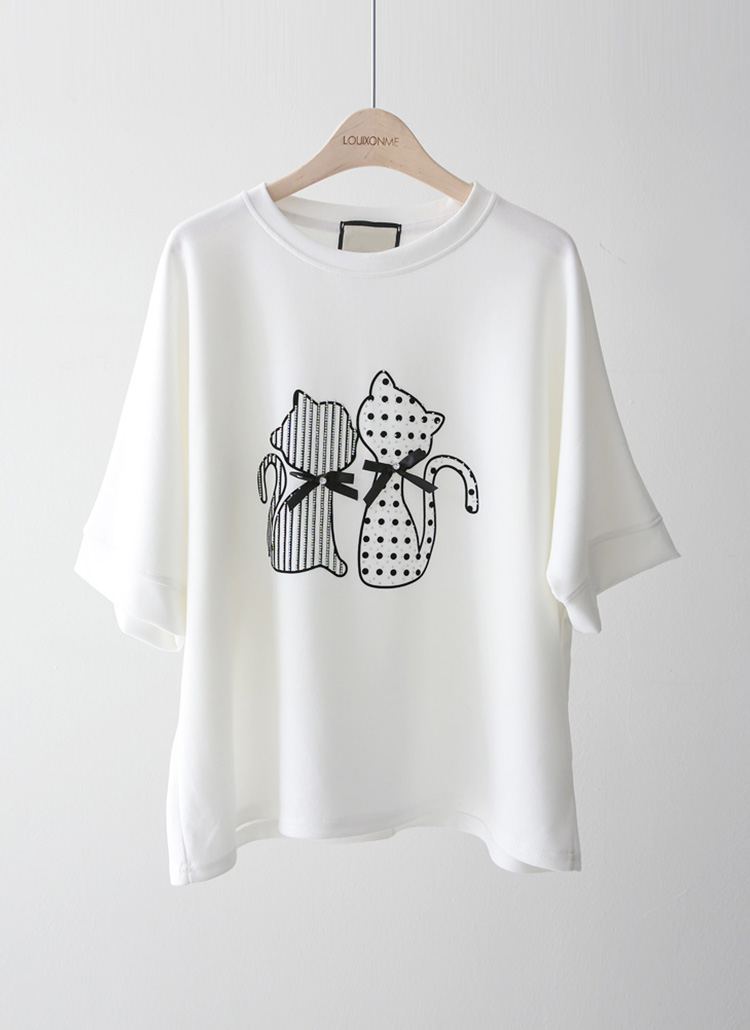 사랑스러운 포인트가 돋보이는 고양이 프린팅 오버핏 티셔츠에요