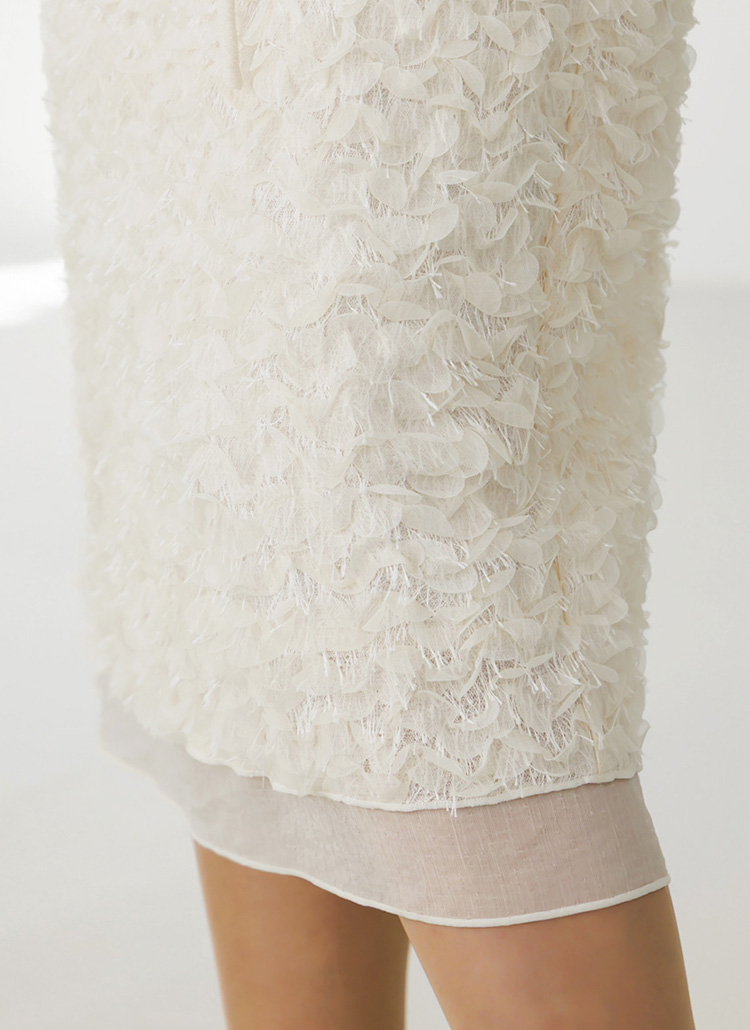 밑단 아래로 가볍게 흐르는 쉬폰 소재 안감이 더 길게 나와있어