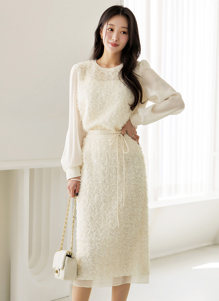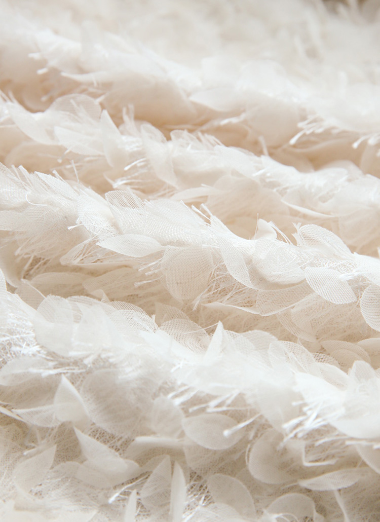 입체적인 텍스쳐와 부드러운 쉬폰 디테일이 조화를 이루어