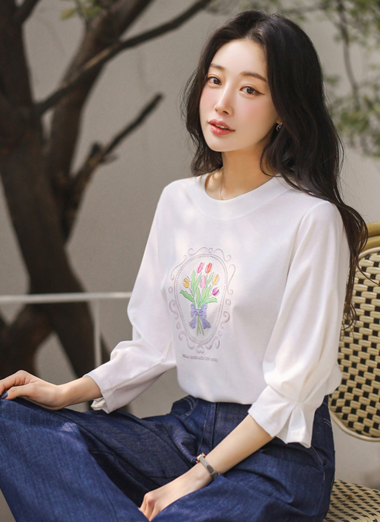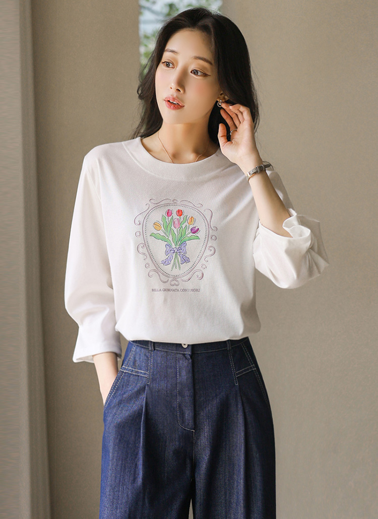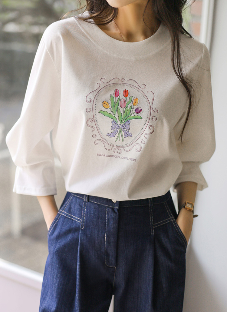 [BRANDUID] 셔링 7부 소매 튤립 부케 큐빅 프레임 프린팅 티셔츠[BRANDNAME] 28,600[PRICE]