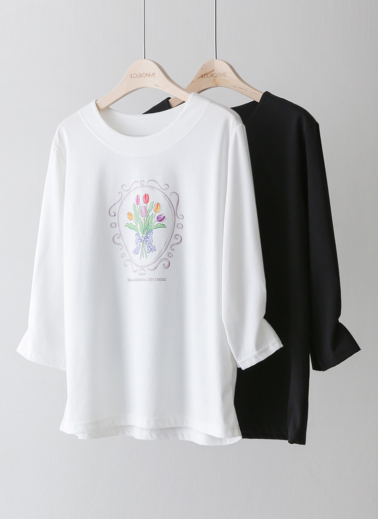 셔링 7부 소매 튤립 부케 큐빅 프레임 프린팅 티셔츠