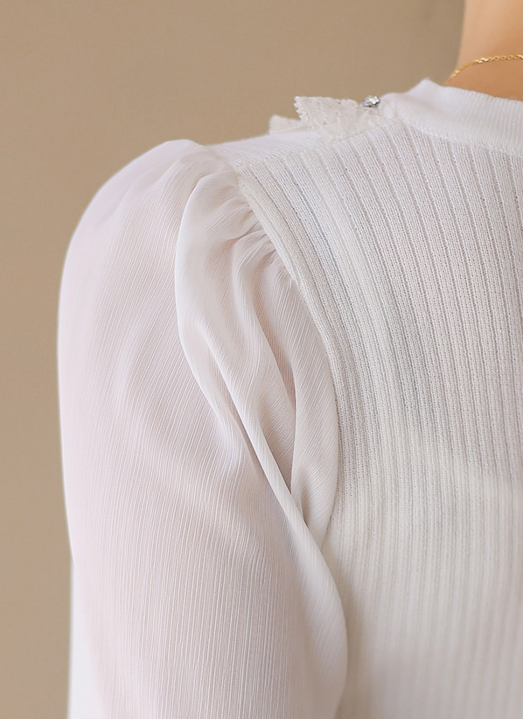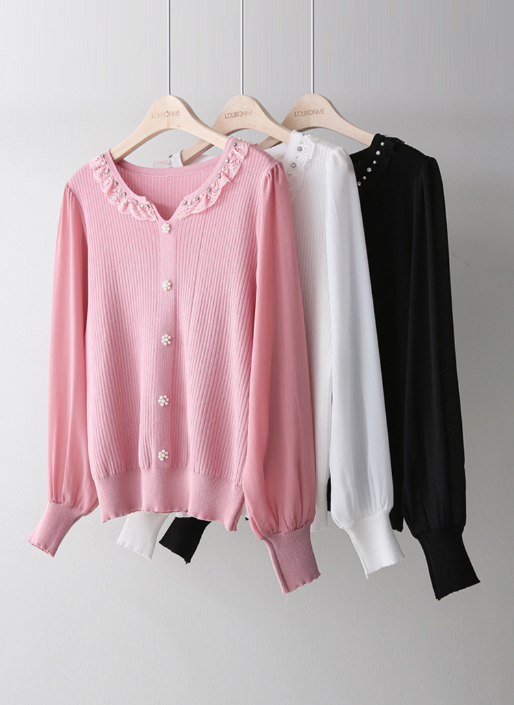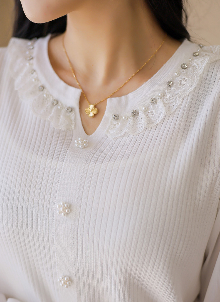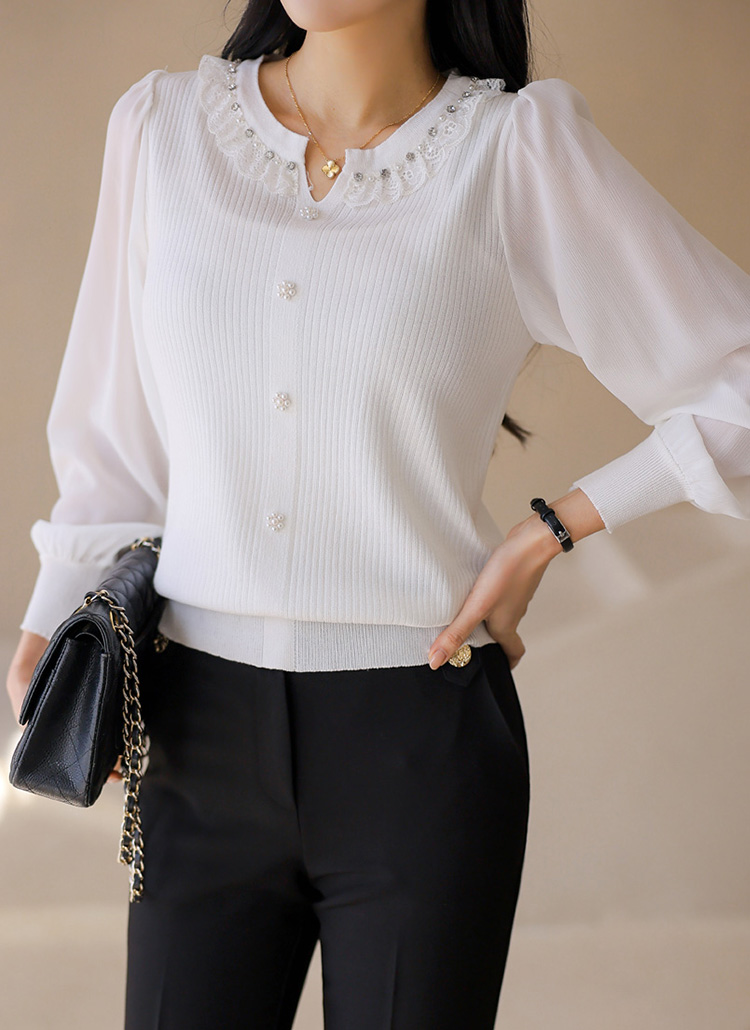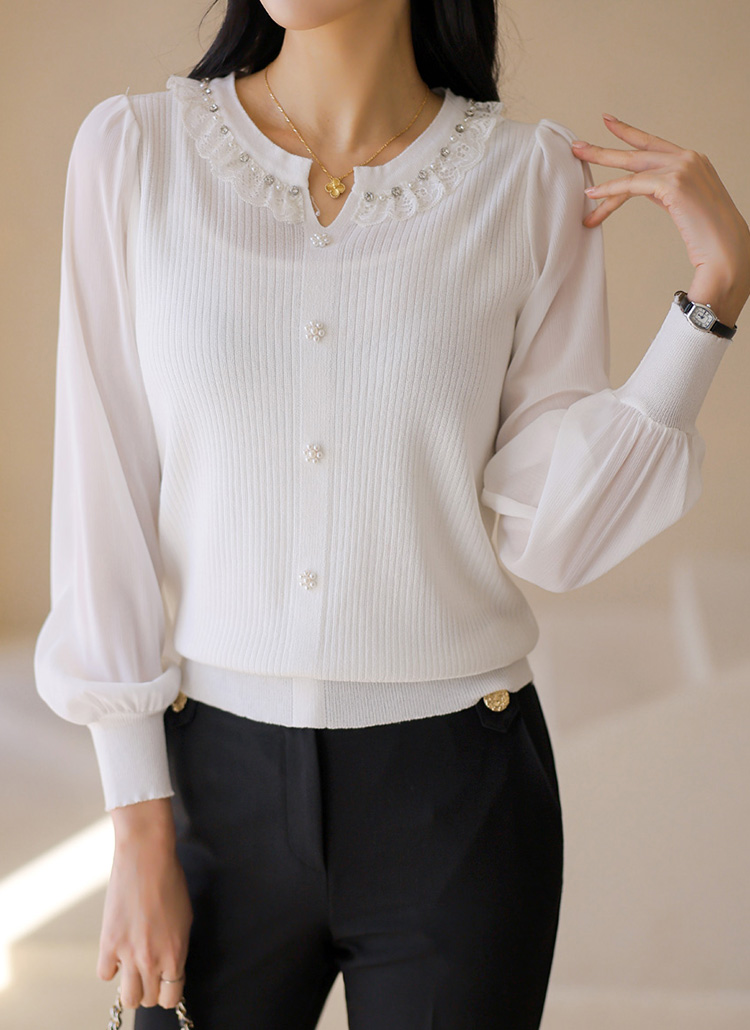 👑라이블 레이스 프릴 진주 쥬얼 넥라인 쉬폰 소매 배색 니트 블라우스👑